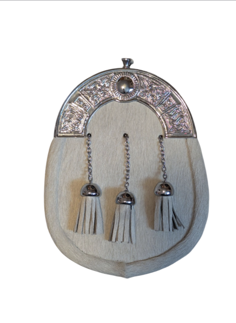Bovine fur and soft leather sporran with belt and chain.